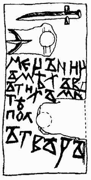 «Аз букы вети»Черноризец Храбр сообщал, что «раньше» не было письменности у славян, «но чертами и резами читаху и гатааху».[127] Такие «черты и резы» сохранились в Боснии до конца прошлого века. Это так называемый «рабош», у русских «бирка». На Западной Украине «раваш» дожил до 1947 года, когда им еще пользовались. Рис. 68. Рабош (раваш) — палочка, на которую наносятся нарезки «для памяти» М. Коэн пишет: «Нужно считать, что до прозелитической деятельности двух греческих братьев, Кирилла и Мефодия, славянский язык передавался при помощи греческого или латинского письма». Прав ли он? Как видим, греческими буквами славяне действительно пользовались, а если мы возьмем «Изборник Киевский» (Киев, 1904), то узнаем, что были славянские тексты, написанные латиницей. Рис. 69. Имя бога осени и урожая Опоры. Надпись на статуэтке из Прильвицы, Рисунок из книги Maseh A. Die GottesdienstlichenAlterthumer der Obotriten, aus dem Tempel zu Rherra, am Tolienzer Zee. Berlin. 1771 Но интереснее всего узнать о кириллице языческого времени. Происхождение письменности на Руси, время ее возникновения, ее характер — одна из самых дискуссионных проблем русской истории. Рис. 70. Так называемые «Фрейзингенские отрывки», славянский текст латиницей (X век). Традиционно появление письменности на Руси связывают с официальным принятием христианства и притоком литературы из Болгарии около 988 года. Но уже в середине прошлого века стали накапливаться отдельные факты, свидетельствующие о наличии письменности на Руси задолго до ее крещения. Одним из подтверждений этого является серия находок в последнее время при раскопках в Новгороде так называемых цилиндров с надписями и княжескими знаками. Эти цилиндры выполняли функцию замков-печатей, гарантировавших сохранность ценностей в мешках. Надписи на них указывают на принадлежность ценностей (или части их) князю или «мечнику», а княжеские знаки дают основание связать эту категорию предметов с княжеским хозяйством. Рис. 71. Цилиндр с надписью, указывающей на принадлежность князю или «мечнику». Рисунок из книги В. Л. Янина «Новгородские грамоты на бересте (из раскопок 1962–1976 гг.)»(М"1978). Два из восьми известных цилиндров были изготовлены, по крайней мере, на 10 лет раньше легендарного крещения Руси. На одном из этих цилиндров надпись плохо сохранилась, а на втором ее можно прочесть: «мечник мех (в) полчетверть в этих мот (ех) Полтвец», где «мех» — мешок, «мечник» — административно-должностное лицо, «мот» — возможно, моток, способ завязывания мешка, а Полтвец — имя мечника. В надписи ясно отразилось новгородское произношение, ее характеризуют и определенные графические особенности: использование одного знака «Ь» для обозначения обоих редуцированных (Ь и Ъ).[128] Но надпись, безусловно кириллицей, относится к так называемым одноеровым памятникам. Важно, что надписи на древнейших цилиндрах свидетельствуют об использовании кириллицы в государственных документах Древней Руси до официального принятия христианства и письменности. Одноеровые памятники известны давно и обнаружены на разных территориях. Некоторые ученые считают, что именно одноеровое письмо — характерная черта первоначальной кириллицы, возникновение которой они относят к IX–X векам. Рис. 72. Надпись на жертвенном ноже: «СВАНТЕВИТЪ», посвященная солнечному божеству Святовиту. Рисунок из книгиMasch A. DieGottesdienstlichen Alterthumer der Obo tri t