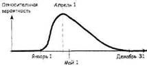 Если то, что вам неизвестно, имеет финансовую значимость для вашего проекта, эта диаграмма называется диаграммой риска. Диаграмма неопределенности показывает набор предыдущих результатов: Согласно условию, мы так строим вертикальную ось, чтобы сумма всех вероятностей равнялась единице. Для большинства «я-не-знаю» вопросов, рассмотрение предыдущих результатов – по сути лучшее из того, что можно сделать для понимания масштабов неопределенности в будущем. Хотя вы не получаете ответа на ваш вопрос, но получаете представление о том, в какой мере вы не знаете ответа. Это помогает вам определить свое место на шкале неопределенности, охватывающей весь спектр от отсутствия представления до полной уверенности. Лучшее определение рискаПерейдем от далекого примера про сад к более волнующей теме: неопределенности относительно того, когда будет готов ваш проект: Пока поверьте нам на слово, что вы всегда сможете построить такую диаграмму для своего проекта, и давайте первым делом сосредоточим внимание на том, чем хорошо для вас такое умение. Можно использовать диаграмму риска для количественной оценки любого рассматриваемого риска. Например, вы ищете точку, для которой площади под кривой слева и справа одинаковы, называя ее риском 50 на 50, это самый ранний срок, когда вероятность успеть вовремя сравнялась с вероятностью не успеть к этому сроку. Вы можете посмотреть правее, где под кривой находится уже 90% площади (похоже, что на рисунке это приходится на май следующего года), и узнать, что при назначении его сроком сдачи вы можете не уложиться лишь с 10%-ной вероятностью. Другими словами, гораздо вероятнее, что вы успеете завершить проект раньше этой даты, чем позже. Вы можете также исключить самые оптимистичные 10% и самые пессимистичные 10% и уверенно считать, что с 80%-ной вероятностью завершите проект в период между нынешним и следующим маем. Диаграмма риска – инструмент для оценки размера риска в любой выбранной вами форме выражения. Но мы собираемся сообщить вам еще более грандиозное понимание диаграммы риска: идею о том, что ситуация, нарисованная диаграммой, и является риском. Это ведет к следующему окончательному определению риска, взамен временного определения, предложенного в главе 2: