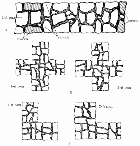 4. Каменные работыКаменные работы – необходимая часть строительного процесса. И для того, чтобы правильно все сделать с первого раза, необходимо внимательно ознакомиться с основными правилами, которые должен знать настоящий каменщик. Виды кладки и их назначениеПеред началом каменных работ необходимо определиться с видом кладки. Существуют следующие виды кладки, которые используют при строительстве домов: кирпичная; кладка из керамических камней; кладка из искусственных крупных блоков, изготовляемых из бетона, кирпича или керамических камней; кладка из природных камней правильной формы (пиленых или тесаных); бутовая кладка из природных неотесанных камней, имеющих неправильную форму; смешанная кладка (бутовая, облицованная кирпичом; из бетонных камней, облицованных кирпичом, и кирпича, облицованного тесаным камнем); бутобетонная кладка; облегченная кладка из кирпича и других материалов. Каменная кладка – это конструкция, которая состоит из камней, уложенных в определенном порядке на строительном растворе. Она несет на себе нагрузки от собственного веса и веса опирающихся на нее прочих конструктивных элементов, а также выполняет теплоизоляционные, звукоизоляционные и другие функции. Для выполнения каменной кладки применяют известковые, смешанные цементно-известковые и цементные растворы, а также цементно-глиняные растворы, в которых глина служит пластифицирующей добавкой. Кладка из керамического кирпича пластического прессования обладает отличной влаго– и морозостойкостью, повышенной прочностью, вследствие чего ее применяют при возведении стен и столбов зданий, подпорных стенок, дымовых труб, конструкций различных подземных сооружений. Кладка из керамического пустотелого или пористо-пустотелого кирпича используется главным образом при возведении стен зданий. Благодаря своей малой теплопроводности эти кладки позволяют сократить толщину наружных стен на 20–25 % по сравнению с толщиной стен, выложенных из полнотелого кирпича. Кладка из бетонных камней, изготовленных на тяжелом бетоне, применяется при строительстве фундаментов, стен подвалов и других подземных конструкций. Кладка из пустотелых и легкобетонных камней используется при возведении наружных и внутренних стен здания. Этот материал обладает хорошими теплоизолирующими показателями, но при этом пустотелые и легкобетонные камни влагоемки, вследствие чего обладают недостаточной морозостойкостью. Учитывая это качество, фасады наружных стен, выложенные из этих камней, штукатурят. Кладка из силикатных камней и кирпича обладает большей прочностью и сроком службы, чем кладка из пустотелых и легкобетонных камней. Однако она более теплопроводна. Из силикатных камней и кирпича возводят как внутренние, так и наружные стены. Низкомарочные легкобетонные и пустотелые бетонные камни применяют исключительно для возведения конструкций, расположенных внутри здания, с нормальным тепловлажностным режимом. Кладка, выполненная из этого материала, обладает большей теплопроводностью, плотностью, однако более прочна и долговечна, чем кладка из легкобетонных камней. Поэтому ее широко применяют для возведения не только внутренних стен, но и наружных. Кладку из крупных бетонных, силикатных или кирпичных блоков, так же как из штучных материалов, используют для в