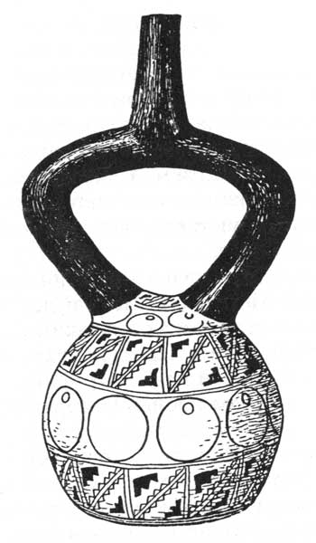 Северное побережьеКультура МочикаКультура Мочика, представленная в долинах Пакасмайо, Моче и Чикама на северном побережье, в большой степени отражает особенности Классического периода. Она была отчасти современником культуры Гальиназо долины Виру, а позднее люди Мочика вторглись в Виру и поработили ее население, расширив свои завоевания до долин Санта, Непенья и Касма. Название Мочика взято из языка, на котором говорили люди Чиму в этой самой области, их предшественники, возможно, тоже говорили на нем. Это подходящее название, вытеснившее старые названия прото-Чиму и ранняя Чиму, поскольку они вносили путаницу, затеняя тот факт, что между Мочика и Чиму имелась разница. Это название сохраняется в современной долине и деревне Моче. Подобно другим народам этого времени, жизнь людей Мочика в значительной степени зависела от сельского хозяйства, но лов рыбы, конечно, также продолжал играть свою роль, так как дело происходило на побережье. Рыба ловилась крюками без шипов и сетями, как с берега, так и с помощью уже упомянутых лодок из тростника. Охота, по оценке изображений на горшках, была скорее спортом высшего класса, чем средством добычи продовольствия. Так, на рисунках богато одетые люди бросают стрелы в оленя, загнанного в сети. Имеются также изображения людей, стреляющих в птиц из духовой трубки, но это, должно быть, являлось своего рода хобби. Оккупация людьми Мочика долины Виру ознаменовалась некоторыми изменениями в распределении участков, но жилье, храмы и крепости, видимо, не претерпели особых изменений. Простые прямоугольные саманные кирпичи оставались обычным строительным материалом. Огромные пирамиды из самана в долине Моче, называемые Уака-дель-Соль и Уака-де-ла-Луна, датируются тем же периодом, как и множество других пирамид и построек в Чикама. Среди них – большой глиняный акведук в Аскопе, который имеет высоту приблизительно 50 футов и простирается на целую милю от устья в засушливую долину. Он оставался неповрежденным, пока его работа не была случайно нарушена в течение необычно дождливого сезона 1925 г., но и сейчас он поражает своим чрезвычайно внушительным видом, дающим некоторое представление о том, на что были способны люди Мочика. Канал в Чикама, 75 миль длиной, все еще орошающий некоторые области около Чан-Чан, столицы Чиму, также относят к этому периоду. В то время как существование таких внушительных сооружений и обширные ирригационные системы подразумевает наличие сплоченной социальной организации, мы знаем о ее деталях совсем немного, кроме того, что можно извлечь из изображения бытовых сценок и отдельных людей, представленных на церемониальной глиняной посуде. Великолепно одетые люди, сидящие на тронах или в паланкинах, по идее должны считаться важными руководителями, другие, на которых может быть надета маска, несомненно, представляют богов или священников, исполняющих роль богов. Богатое захоронение из долины Виру, которое будет описано позже, очевидно, также принадлежит воину и священнику, одетому наподобие бога. Комбинации аналогичного рода и многочисленные рисунки воинов и оружия показывают, что организация того времени не была исключительно теократической, как это, судя по всему, будет позже в раннем Созидательном периоде, но была также и сильная светская власть. Разнообразие в формах и каче
