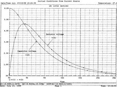 6. Переходные процессы и анализ во временной областиАнализ переходных процессов является еще одной из полезных возможностей PSpice. Математический расчет переходных процессов может оказаться довольно утомительным и долгим. Он предусматривает сложные преобразования дифференциально-разностных уравнений при определенных граничных и начальных условиях. PSpice позволяет нам получить полную информацию за короткое время и лучше понять процессы, воспользовавшись широким набором временных зависимостей токов и напряжений. Замыкание ключа в RL-цепяхВ каждой схеме при попытке изменения ее энергетического состояния происходит хотя бы кратковременный переходной процесс. В качестве примера на рис. 6.1 показана схема с источником напряжения в 1 В, ключом (в начальный момент он закрыт), резистором R и катушкой индуктивности L. Посмотрим, что же произойдет сразу после замыкания ключа. Из курса теоретической электротехники известно, что ток достигнет установившегося значения V|R не сразу, нарастая по экспоненте. Постоянная времени нарастания τ=L|R представляет собой время, требуемое для достижения током 63,2% установившегося значения. Через 5τ! ток почти достигнет установившегося значения, отличаясь от него не более чем на 1%. Рис. 6.1. Замыкание ключа в RL-цепи В PSpice, мы исследуем этот переходной процесс, воспользовавшись источником с кусочно-линейным выходным напряжением PWL (piecewise linear). Он будет задан командой, описывающей приложенное напряжение, следующим образом: V 1 0 PWL (0,0 10us,1V 10ms, 1V) Команда показывает, что напряжение приложено между узлами 1 и 0 и его форма задана отрезками прямых (PWL). Параметры в круглых скобках представляют собой пару значений: момент времени — напряжение. В данном примере в момент t=0 V=0; затем при t=10 мкс V=1 В; при 10 мс V=1 В. Изменение напряжения между двумя соседними моментами времени осуществляется по отрезку прямой. Посмотрите, как выглядит временная функция напряжения. Теперь можно записать входной файл: Switch Closing in RL Circuit V 1 0 PWL (0,01us,1V 10ms, 1V) R 1 2 100 L 2 0 0.1H .TRAN 1ms 10ms .PROBE .END Первое значение, показанное в команде .TRAN, является значением шага в распечатке. Выберите его равным приблизительно одной десятой части второго значения, которое указывает длительность анализируемого процесса. Выполните анализ и получите график I(R). Обратите внимание, что ток, как и ожидалось, нарастает по экспоненте, достигая установившегося значения в 10 мА. Используйте режим курсора, чтобы определить начальную скорость изменения тока Δi|Δt. Для определения отношения приращений вы можете выбрать временной интервал приблизительно в 50 мкс. Убедитесь, что в начале процесса Δi|Δt=10 А/с. Если ток будет увеличиваться с этой скоростью вплоть до установившегося значения 10 мА, то когда он этого значения достигнет? Как вы знаете, через время, равное постоянной времени τ, ток должен достигнуть 0,632 от установившегося значения. Проверьте по графику, что это значение (6,32 мА) достигается через t=1 мс. Сверьте полученный вами график с рис. 6.2. Рис. 6.2. График тока для схемы на рис. 6.1 Если вы впервые сталкиваетесь с понятием постоянной времени, получите график при других параметрах, что поможет вам лучше разобраться с этой концепцией. Удалите график тока и получите графики трех напряжений: V(1), (V)2 и V(1,2). Напряжение V(1,2) является более коротким обозначением разности V(1)–V(2). Установив начальную зад