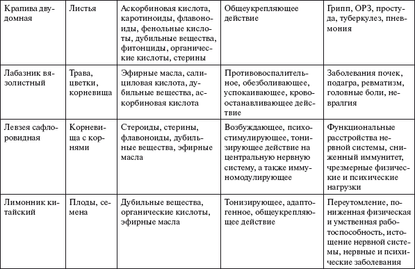 Приложение. Основные компоненты биологически активных добавок Продукты природного происхождения Водоросли Ламинария (морская капуста) – крупная бурая водоросль. Особенностью ламинарии, определяющей ее профилактические и оздоровительные свойства, является высокое содержание белка, а также биологически активных веществ, которые делают ее незаменимой для получения ряда биодобавок. Богатый химический состав делает ламинарию прекрасным средством, защищающим от радиоизлучения. Ее использование повышает устойчивость организма ко многим неблагоприятным внешним факторам, уменьшает риск возникновения онкозаболеваний. Ламинария – прекрасный источник йода в легко усвояемой организмом форме. Спирулина объединяет много видов синезеленых водорослей. Ее используют для профилактики и лечения раковых заболеваний. Кроме того, спирулина улучшает работу иммунной системы, в частности, за счет стимуляции макрофагов – специальных клеток крови, которые можно назвать «чистильщиками», так как они помогают удалению отходов из организма. Спирулина – прекрасный источник полноценных белков, витаминов группы В, гамма-лино-леновой кислоты, железа в легко усвояемой организмом форме, йода. Хлорелла – одноклеточная водоросль, которая встречается как в пресных, так и соленых водоемах, влажной почве. Многие страны наладили промышленное производство хлореллы, так как она является прекрасным источником белка. Хлорелла изобилует и другими питательными веществами, в том числе витаминами группы В, химическими элементами (в частности магнием). В ней очень много хлорофилла, который способствует выведению из организма тяжелых металлов, таких как кадмий и уран. Богата хлорелла каротиноидами, являющимися прекрасными антиоксидантами. Имеется в хлорелле и еще один компонент – хлореллан, который укрепляет иммунную систему, способствуя выработке интерферона. Хлорелла стимулирует развитие полезной микрофлоры кишечника, улучшая работу желудочно-кишечного тракта. Лекарственные растения В настоящее время огромное количество биологически активных добавок создано на основе лекарственных растений или биологически активных веществ, полученных из них. Экстракты из растений богаты всеми биологически активными веществами, так необходимыми нашему организму, поэтому они являются обязательными компонентами большинства БАДов. Например, цветочная пыльца активизирует деятельность нервной системы, а грибы способствуют нормализации иммунитета и помогают организму адаптироваться к стрессу. Сведения о действующих веществах, показаниях и практическом применении некоторых лекарственных растений приведены в табл. 1. Микроорганизмы В желудочно-кишечном тракте находится специальная микрофлора, которая нормализует его работу (лактобактерии, бифидобактерии, дрожжи и др.). Существует много факторов, нарушающих состояние микрофлоры. Одним из таких факторов является чрезмерный прием антибиотиков, которые без разбора уничтожают как вредные, так и полезные бактерии. К другим факторам, нарушающим бактериальный баланс, относится плохое или, вернее, неправильное питание, а также стресс и химическое загрязнение окружающей среды. Чтобы помочь организму противостоять этим негативным явлениям, были разработаны специальные биологически активные добавки на основ