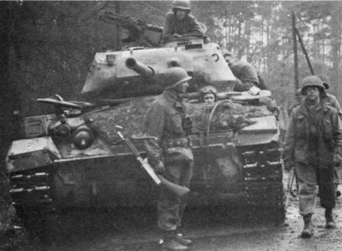 Light Tank M24 General Chaffee Разрабатывался с учетом опыта мирового танкостроения, накопленного за годы Второй мировой войны. Во внешнем облике танка, резко отличавшемся от всех ранее созданных американских легких боевых машин, угадывается влияние советского среднего танка Т-34. Предназначался для использования в качестве разведывательного и авиадесантного. Первый американский танк с торсионной подвеской. Производился фирмами Cadillac Саг Division, American Саг and Foundry и Massey Harris. С апреля 1944 по июнь 1945 г. изготовлено 4070 единиц. КОНСТРУКЦИЯ И МОДИФИКАЦИИ Корпус и башня сварные, броневые листы, примерно такой же толщины, как у танков серии М5, располагались под значительно большими углами наклона к вертикали. Силовая установка размещалась в кормовой части танка, а механизм поворота и бортовые передачи – в носовой. 75-мм пушка (модернизированный вариант авиационного орудия, использовавшегося на самолете B-25G Mitchell) снабжалась стабилизатором в вертикальной плоскости типа "Вестингауз". Силовая установка и трансмиссия были заимствованы у легкого танка М5, а подвеска у самоходного орудия М18. Особенностью М24 является наличие дублированных приводов управления танком у пулеметчика (он же – помощник механика-водителя). В боевом отделении находилось дополнительное (пятое) сиденье для командира подразделения. Легкий танк М24 (вверху и внизу). Американские войска в Европе получили эти танки зимой 1944 – /945 гг. Легкий танк М24 из 740-го танкового батальона 82-й воздушно-десантной дивизии. Новые танки эта часть получила зимой 1945 г. после "Битвы за выступ" (сражение в Арденнах) Легкий танк М24 и пехота в окрестностях Хаультхаузена. Германия, март 1945 г. Легкий танк М24 в боевом охранении. Бельгия, январь 1945 г. Выкрашенный в зимний камуфляж танк М24 18-го кавалерийского разведывательного эскадрона 14-й кавалерийской группы. Бельгия, февраль 1945 г. С лета 1944 г. танки М24 начали поступать в войска и интенсивно вытеснять из боевых частей устаревшие "стюарты". Боевой дебют М24 состоялся в декабре 1944 г. в составе 740-го танкового батальона 82-й воздушно-десантной дивизии, во время отражения германского наступления в Арденнах. Эти бои подтвердили, что ни по вооружению, ни по бронированию "Чаффи" не может тягаться с немецкими средними танками. И хотя на боевой счет новых американских машин и записали несколько подбитых "пантер" и даже "тигров", эти удачи можно отнести к случайностям. Тем не менее М24 довольно интенсивно использовались американцами и англичанами (последние получили из США около 300 машин этого типа) вплоть до конца войны. В качестве авиадесантного "Чаффи" предполагалось использовать так же, как М22, то есть перевозя башню от него внутри самолета С-54, а все остальное на наружной подвеске. Только появление транспортного самолета С-82 грузоподъемностью 10 т позволило перевозить танк без башни внутри фюзеляжа. Из-за сложности транспортировки М24 не нашел широкого применения в воздушно- десантных войсках армии США. Танк послужил базой для создания нескольких образцов самоходно-артиллерийских установок. После Второй мировой войны М24 использовался американскими войсками в Корее, а французской армией – в Индокитае. В 1950-х годах танк интенсивно экспортировался и долгое время состоял (а кое-где и до сих пор состоит) на вооружении в Греции, Норвегии, Пакистане, Португалии, Тайване, Таиланде, Турции